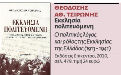 Σκίτσο του Φωκίωνα Δημητριάδη σχετικά με την υπόθεση αρχιερέων που είχαν κατηγορηθεί για συμμετοχή ή εύνοια στο βενιζελικό κίνημα της 1ης Μαρτίου 1935 Στην πραγματικότητα, όπως ξεκάθαρα προκύπτει και μέσα από αυτήν τη μελέτη που ξεκινά από τις νίκες των Βαλκανικών Πολέμων και φτάνει ως την Κατοχή, «το κόμμα του Θεού» είναι «θεσμικό», δεν έχει χρώμα. Γι΄ αυτό και οι πολιτικές δράσεις της Εκκλησίας δεν είναι ταυτισμένες με αυτό που οι πιο πολλοί δικαίως φαντάζονται, δηλαδή με τα δεξιά του πολιτικού φάσματος- το αντίθετο μάλιστα: «Η Ορθόδοξος Ιεραρχία δεν δύναται να παραδεχθεί ότι η Κυβέρνησις των φιλελευθέρων και ο μεγαλοπράγμων αυτής ηγέτης, ο το παν ανακαινίσας εν τω Κράτει, ο κλείσας αυτό και οδηγήσας δόξη και τιμή εστεφανωμένον επί της οδού της νίκης, του θριάμβου και της εθνικής παλιγγενεσίας θα θελήσει να εγκαταλείψει την Ορθόδοξον Ελληνικήν Εκκλησία έρμαιον του πρώτου τυχόντος μικροκομματάρχου...».